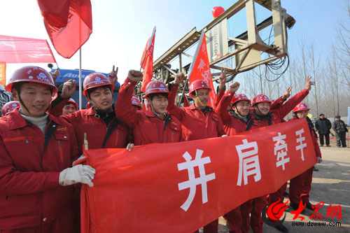 四川地礦局山東打井隊(duì)在奔赴打井現(xiàn)場(chǎng)前誓師助威。