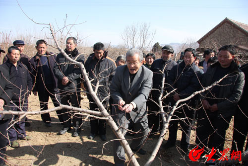 從濟(jì)南來(lái)的農(nóng)業(yè)專家現(xiàn)場(chǎng)指導(dǎo)果農(nóng)如何進(jìn)行果樹(shù)抗旱。