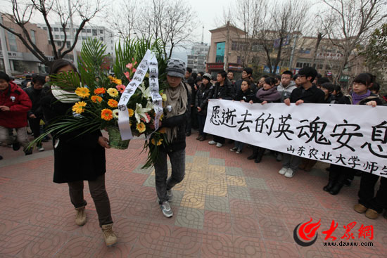 大眾網(wǎng)泰安1月5日訊(記者 曹亮 盛堃)“灑一腔熱血 鑄泰山英魂”,白底黑色大字莊嚴肅穆,白黃菊花整齊的擺放在泰安民警堵截歹徒的事發(fā)地點。自從今天上午9時起,泰安市民自發(fā)組織起來,悼念在“1.04”襲警案件中因公犧牲的兩名民警、一名協(xié)勤。