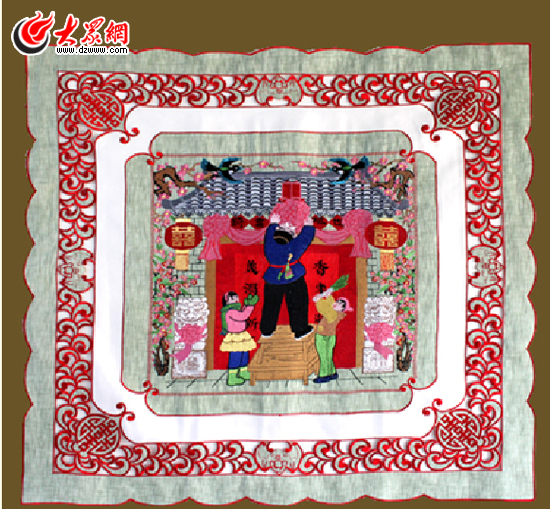 “這幅畫繡是今年第七屆(深圳)中國國際文化產(chǎn)業(yè)博覽交易會銀獎作品!”趙家樂指著一幅名為《喜盈門》的畫繡給記者說,“它經(jīng)過了手工繪畫、電腦制版、機器刺繡、手工鏤空等十幾道制作工序!睋(jù)趙家樂介紹,這幅畫繡主要通過喜上梅梢、紅燈高掛、貼聯(lián)結(jié)彩、喜氣盈門等來體現(xiàn)濃郁的地方生活氣息。同時,用質(zhì)樸的日照農(nóng)民畫繡表型形式,進一步的將民俗藝術(shù)與現(xiàn)代的生活元素相結(jié)合,因此滿足了婚慶習俗消費群體,對民間婚慶藝術(shù)品的需求!跋襁@個作品我們能賣到900多塊錢一幅,作為婚慶產(chǎn)品一直銷量很好。在文博會上,我們的農(nóng)民畫繡不僅獲獎,還簽下了80萬元的訂單!