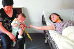 7月3日,躺在病床上的吳菊萍用右手握著7個(gè)月大兒子陳至軒的小手。新華社發(fā)
