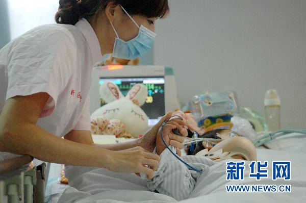 圖為7月11日,護士在重癥監(jiān)護室擺放好妞妞的右手。妞妞的手腳已經(jīng)有了不自主的運動。